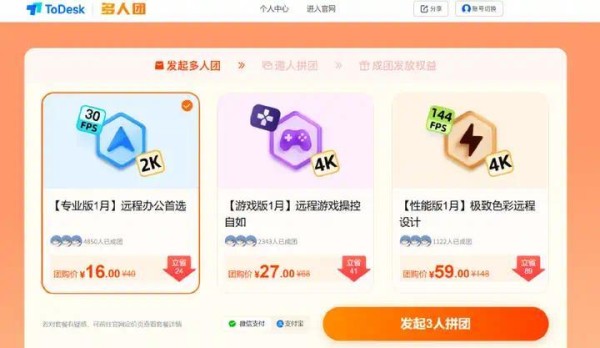 ToDesk远程控制服务推出重磅拼团活动,让高效远程连接变得更加触手可及。新人两人即可成团,非新人也仅需三人组团,即可享受专业版、游戏版、性能版三大版本的四折超值优惠!