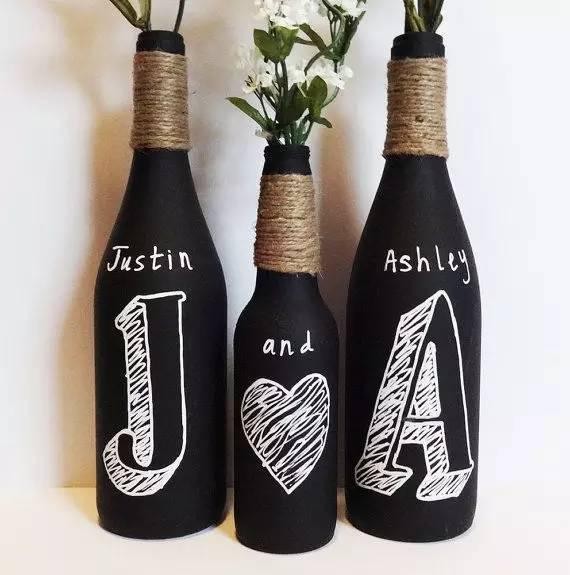 喝完酒的葡萄酒瓶子,将酒标撕掉,然后运用你天马行空的思维画上自己喜欢的颜色和图案,在瓶颈绑上绳子,一个艺术品就完成了。