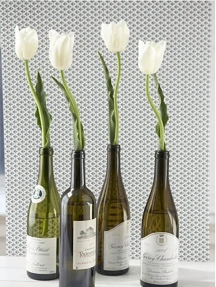 再直接点,连酒标都不用撕掉,直接装水插花,几个摆在一起观赏效果也是不错的,废物利用还省了买花瓶的钱,一举两得。