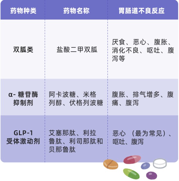 部分降糖药物的使用也会增加消化不良的可能,例如二甲双胍、α-糖苷酶抑制剂、GLP-1 受体激动剂等药物都可能引起胃肠道不适[7]。