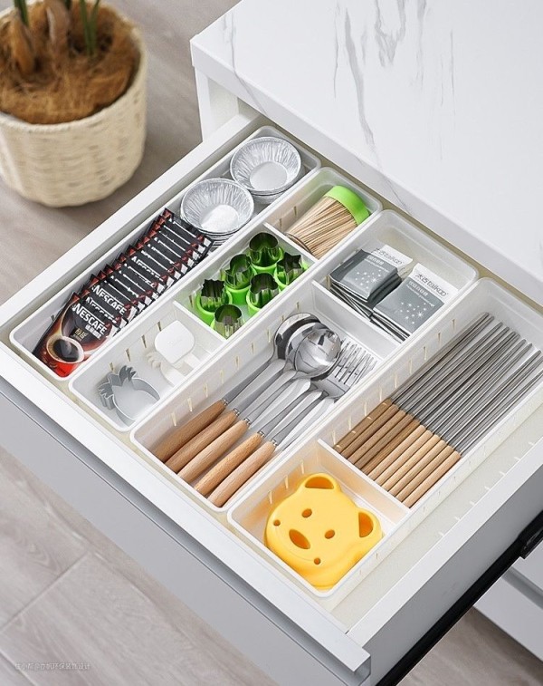 1.隔板变抽屉,利用好橱柜的深度。