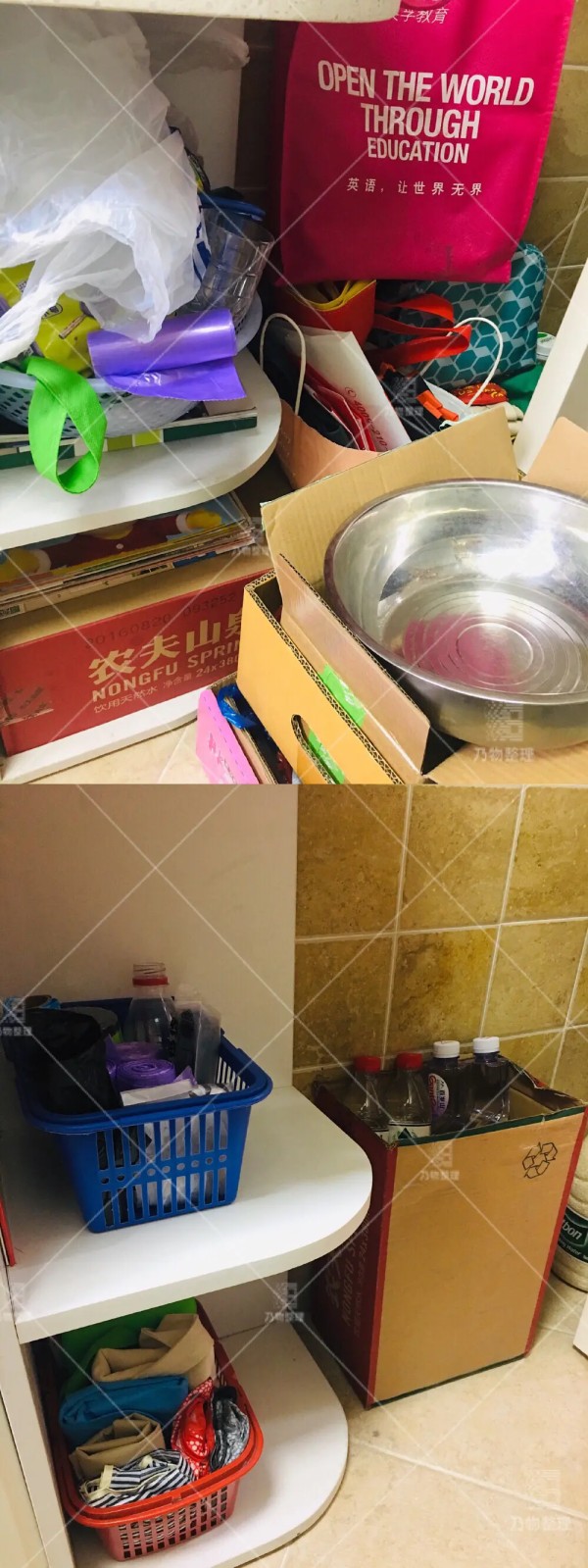 客户居住在寸土寸金的徐家汇,目前该区域房价8万一平。截取几张前后对比图,从上午9:00-17:30,厨房、玄关也是耗时最难最易脏乱的地方,不整理永远不知道在昂贵有限的空间里放了多少不需要的物品,过期食物,为了人情收下的东西。厨房的面积偏小,H型极不合理,也请设计师在前端工作时考虑而不是为了完成工作而工作,动线明显增加劳动量与时间成本,在我解释后客户才反应过来厨房洗、切、烧区域的弊端。根据客户家庭生活习惯规划按照频率使用的物品区域。要去思考物品为什么会多?是否真的需要,三思后在带回家。家家都有很多杯(悲)具,家庭成员分冷热交替使用即可,好看的只会越来越好看永远买不完。从应该到能够并不容易,找到家务活的帮手也是智慧,物品分类清晰,提高效率。原则之一~“取物方便,就近原则”。