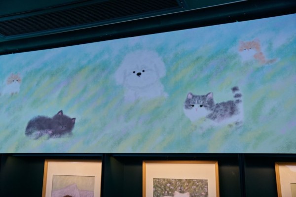 走进展厅,观众被带入一个由细腻笔触构建的温暖世界。Xuān以其标志性的手绘肌理技法,生动勾勒出猫咪窝在书堆旁打盹、小狗迎接主人的温馨场景。这些作品不仅捕捉了动物们的灵动神态,更折射出现代家庭关系的微妙变化——当孩子通过照顾宠物学会责任,当独居者因为一只猫而有了回家的期待,当争吵的夫妻被毛孩子无意间“调解”,这些毛茸茸的家庭成员正在重新定义“家”的含义。