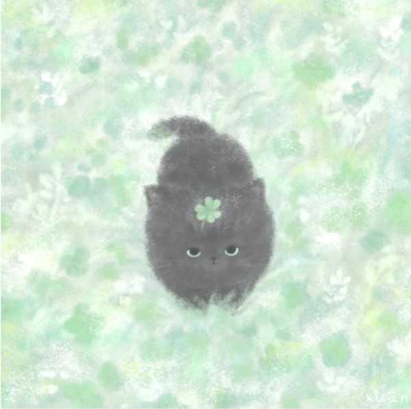 Xuān笔下的动物有许多温暖的细节。一只黑猫优雅地蜷缩在葱郁的草丛中,一片幸运的四叶草轻轻落在它的头顶。黑猫睁大圆润的双眼,瞳孔中倒映着摇曳的草叶,流露出孩童般纯真的好奇,仿佛下一秒就要伸出爪子去触碰这片从天而降的幸运礼物。
