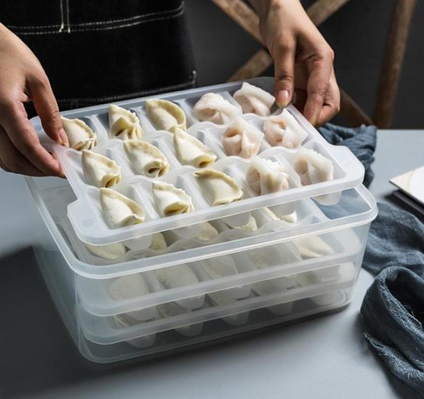 将饺子存放在保鲜盒里,上层为大格设计,可以叠加,对于爱吃饺子,平时可以做早餐和夜宵,可以用上这款保鲜盒进行收纳。
