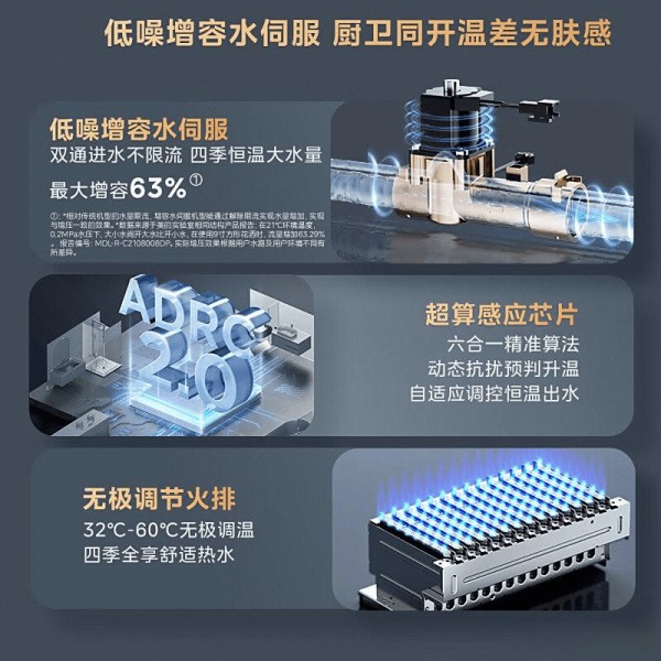 热水器的6重净滤系统更是令人安心,它能有效过滤水中的杂质,保证出水清洁,守护你和家人的健康。速热功能让你无需长时间等待,即可享受到源源不断的热水。静音设计则确保了热水器在运行过程中不会产生噪音,为你营造一个宁静的生活环境。