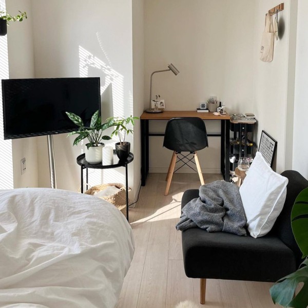・ 背の高い家具をおかず、白で統一することで部屋を広く見せる