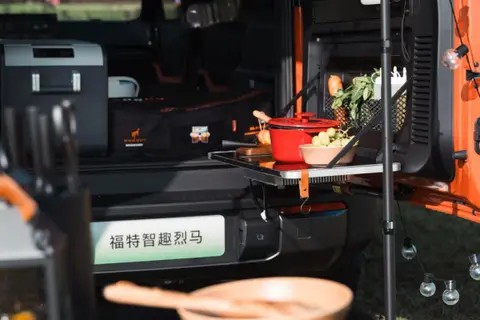 针对这一痛点,福特智趣烈马为用户提供户外烹饪的解决方案。为了打造移动“山野厨房”,福特智趣烈马在尾门集成了“切配 + 烹饪”双分区承重桌板。桌板可承重18kg,一边可以切配菜品,另一边可嵌入电磁炉实现烹煮功能。新车搭配同级最强的6.6kW外放电功能,因此“厨房”可支持电磁炉、电水壶、咖啡机等多台大功率电器同时工作。