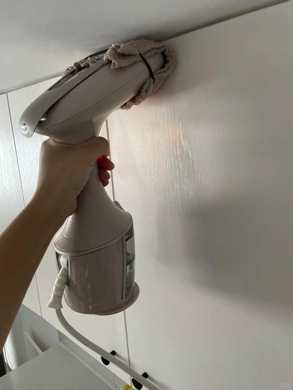 烫头那里包块湿抹布,油污重的地方再加张厨房湿巾,蒸汽一喷,再一擦,墙面和柜体立马就干净了,还顺带高温消毒,真香!