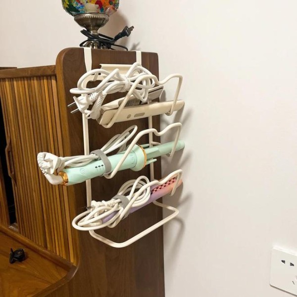 卷发棒用完直接放上去,散热、收纳两不误;再配上几根魔术贴绑带,把电线固定好,好拿好用,看着整洁又清爽。