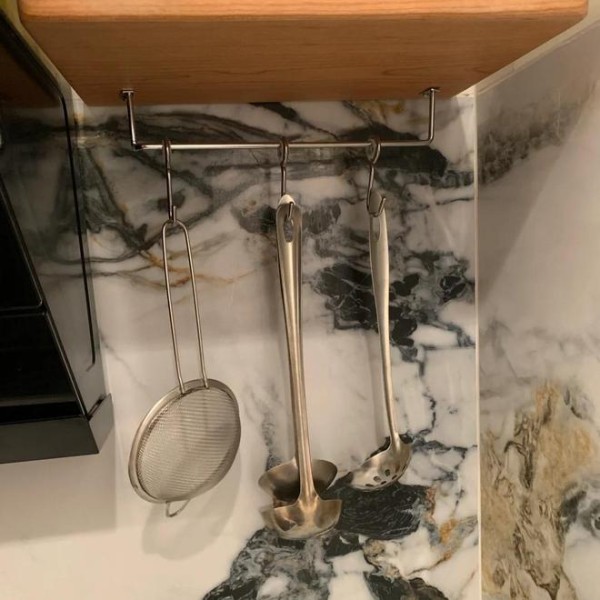 两块钱一根,用螺丝固定在层板底部,配上3块钱买的3个挂钩,用来挂汤勺,铲子,稳得很;还带点复古味。