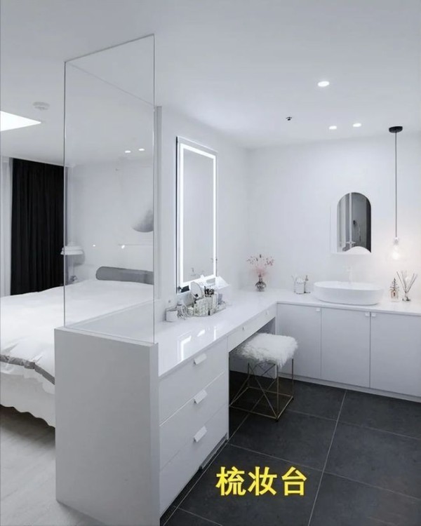 如果你追求精致的生活品质,那么将梳妆台与玻璃隔断相结合的设计将是一个不错的选择。它既能为你提供一个独立的梳妆空间,又能通过玻璃隔断保持与卧室内部的视觉联系,同时确保隐私不受侵犯。这样的设计更适合面积较大的卧室,至少需要15平方米以上的空间才能展现出最佳效果。