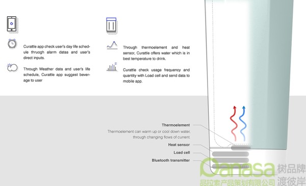 Curattle是一款便携式智能家居水杯,可以通过内置蓝牙与智能手机利用配套APP进行远程控制。它可以根据饮品类型制定不同饮品计划和温度设定,让用户随时随地享受热饮。此外,它可通过APP制定时间表,定时提醒,合理规划饮水时间和不同时段的饮品类型,在保证健康的同时极大程度满足用户的个人需求。