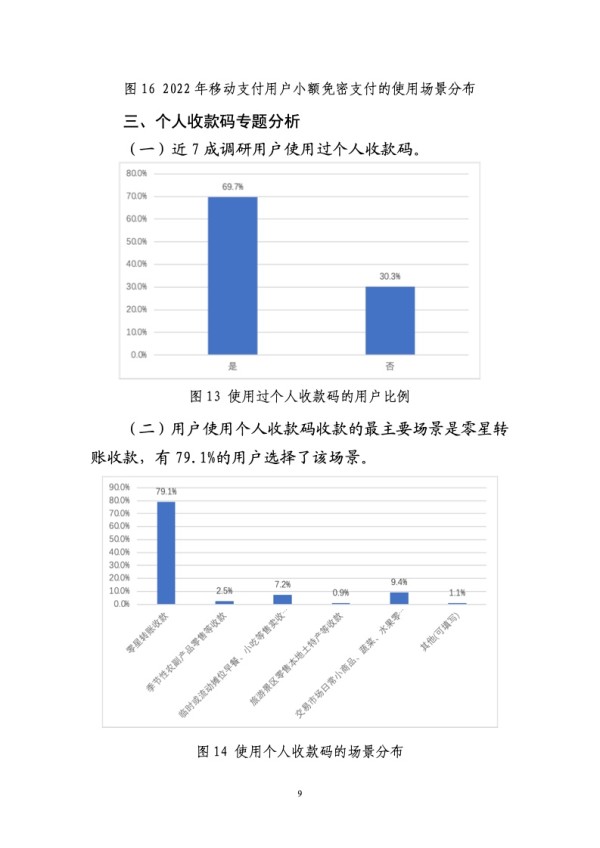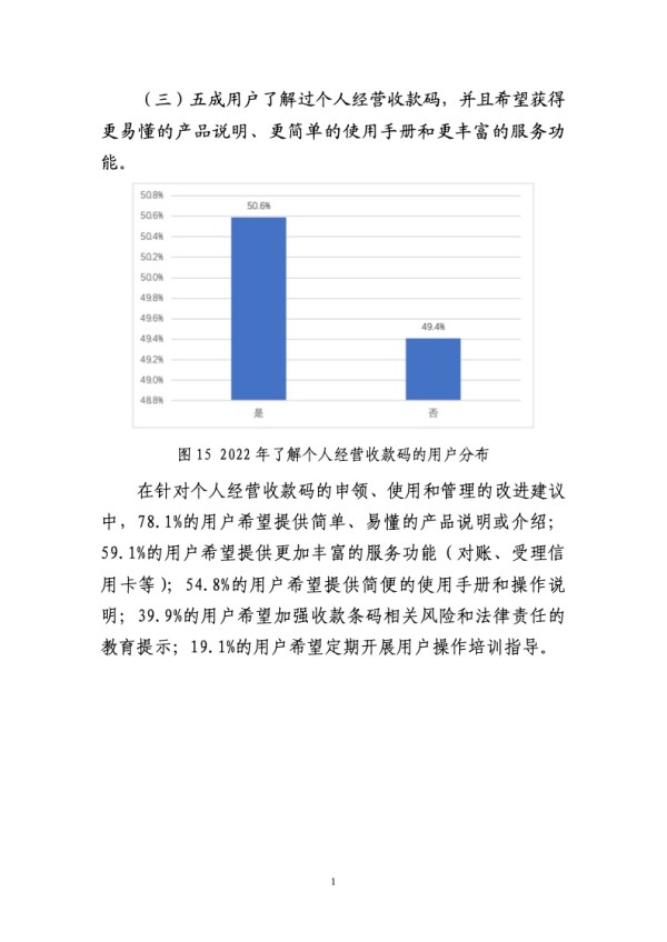 在个人收款码方面,近七成调研用户使用过个人收款码。用户使用个人收款码收款的最主要场景是零星转账收款,有79.1%的用户选择了该场景。五成用户了解过个人经营收款码,并且希望获得更易懂的产品说明、更简单的使用手册和更丰富的服务功能。