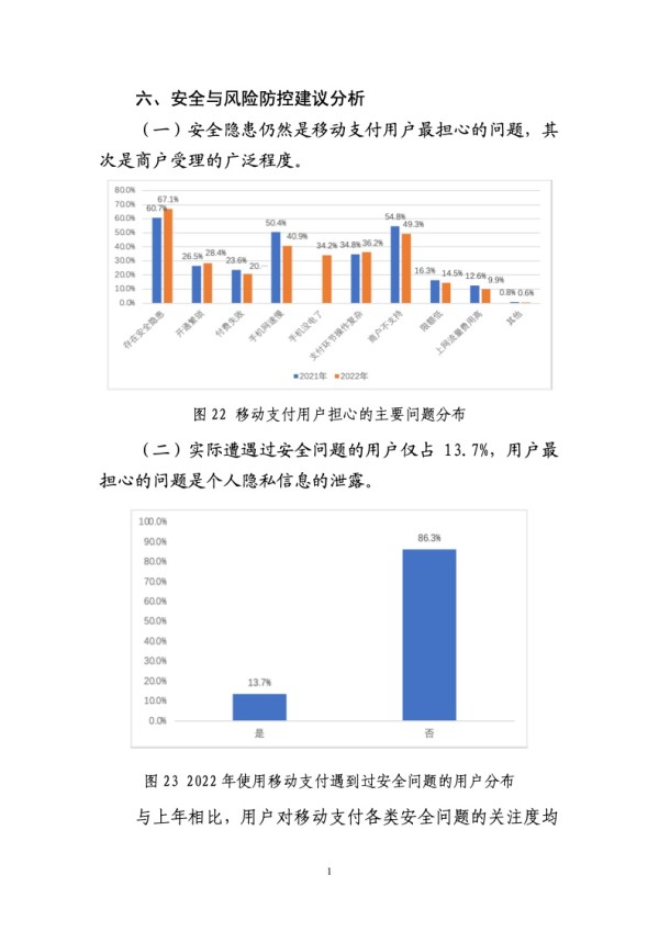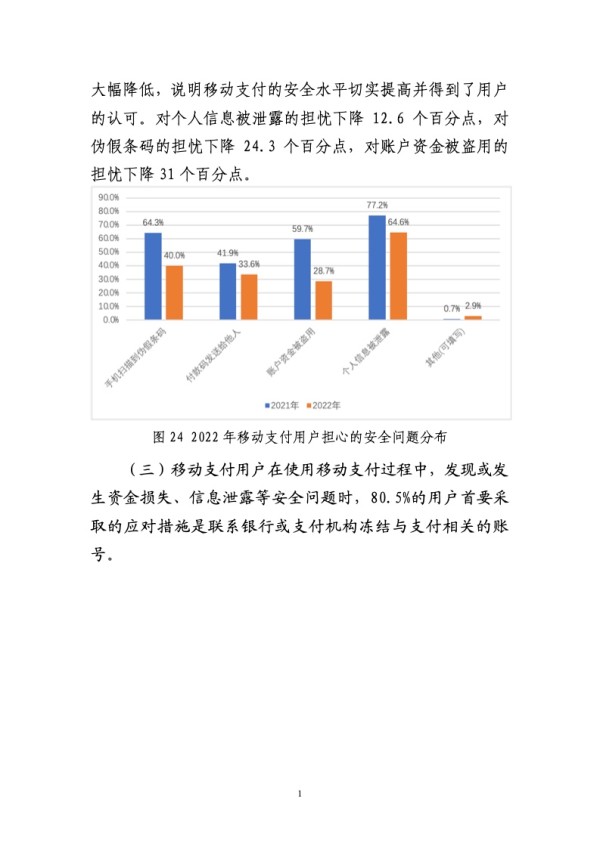 值得注意的是,安全隐患仍然是移动支付用户最担心的问题,其次是商户受理的广泛程度。实际遭遇过安全问题的用户占13.7%,用户最担心的问题是个人隐私信息的泄露。但与上年相比,用户对移动支付各类安全问题的关注度大幅降低,说明移动支付的安全水平切实提高并得到用户的认可。对个人信息被泄露的担忧下降12.6个百分点,对伪假条码的担忧下降24.3个百分点,对账户资金被盗用的担忧下降31个百分点。基于此,用户最期望市场主体采取的保障措施是及时进行支付风险提示,占比为83%。