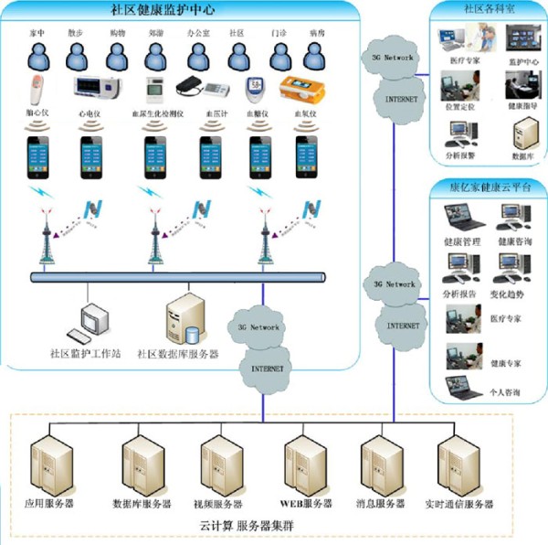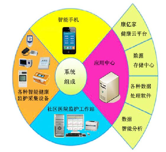 系统主要有各种智能健康医疗设备采集终端、智能手机客户端、社区医院监护系统工作站、康亿家智能健康云平台等应用平台组成。