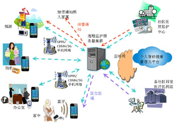 病人可以在家里、马路上、办公室、旅游、购物各种情况下通过随身携带的各种智能监护采集设备实时进行人体各种生命信息采集,智能手机程序实时接收采集设备数据,进行实时分析和心电显示,同时发送到社区医院监护服务中心,医生进行各种监护数据查看分析,并将分析结果存储到病人数据库中,如有异常会实时报警。