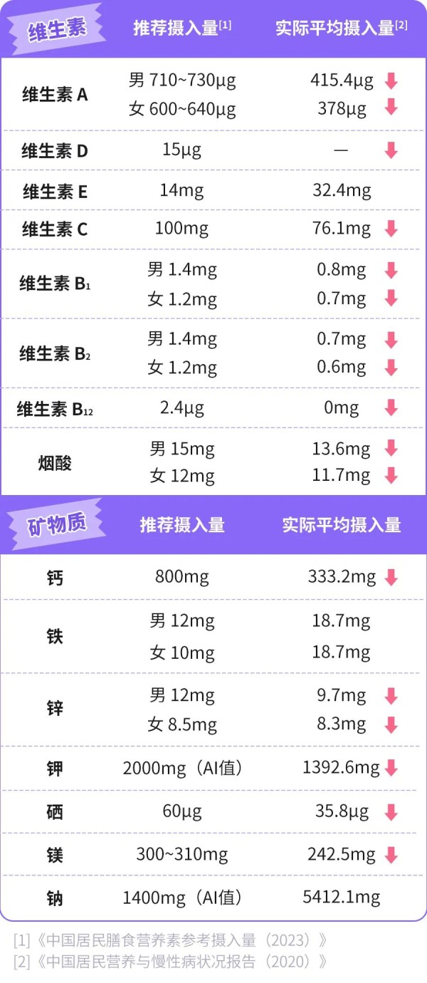 而值得注意的是,老年人普遍没有补足的关键营养素也不少:维生素 A、维生素 B 族、钙等。