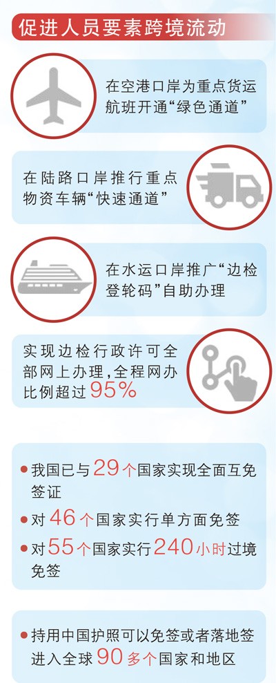 在空港口岸为重点货运航班开通“绿色通道”,在陆路口岸推行重点物资车辆“快速通道”,在水运口岸推广“边检登轮码”自助办理,实现边检行政许可全部网上办理,全程网办比例超过95%,在24个口岸新增“一带一路”专用通道240余条……
