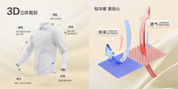 所谓0感,指的是“0压、0皱、0摩擦、0束缚”。0感舒适衬衫首创红豆超细旦纤维,轻如羽毛,弹性十足,透气性极佳,即便炎炎夏日,也能感受到如沐春风般的凉爽与自在。同时,创新运用瑞士HeiQ智能控温科技,让面料拥有感知外界温度并自动调节的能力,实现“热缩冷胀”智能温控效果,在任何环境下都能保持恰到好处的舒适。