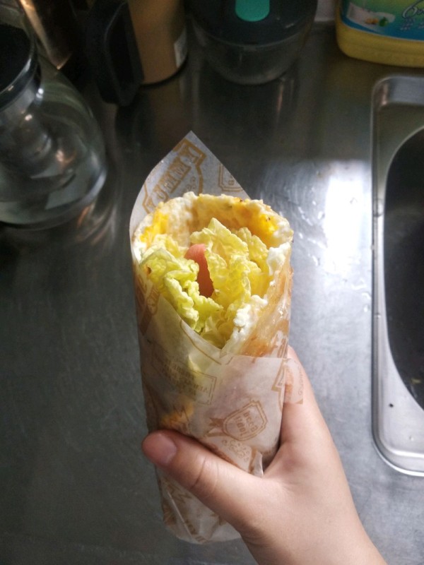 根据我多次失败的经验来讲,饼还是往上面放放的好,火腿肠斜着放,从左往右卷,比较好豪横