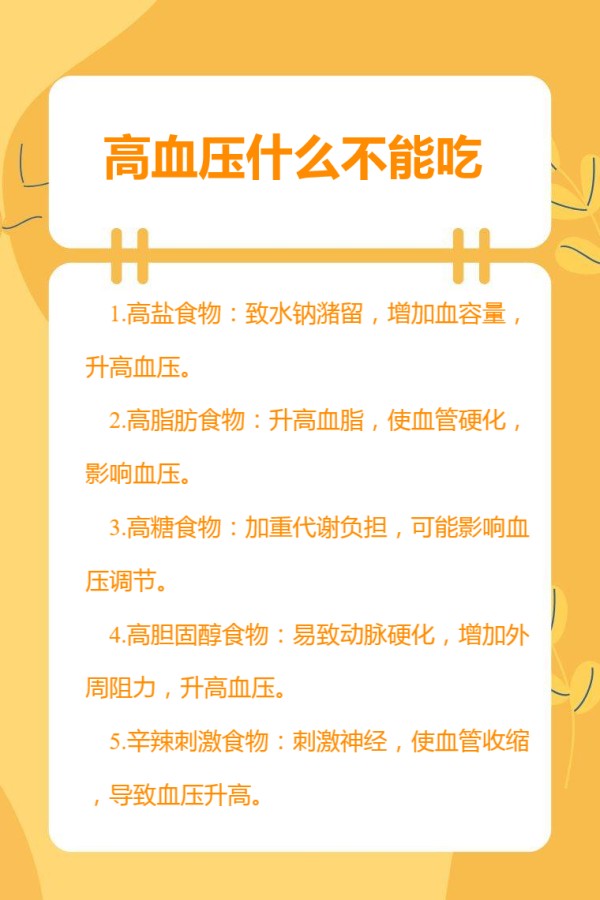 高血压不能吃高盐食物、高脂肪食物、高糖食物、高胆固醇食物、辛辣刺激性食物等。