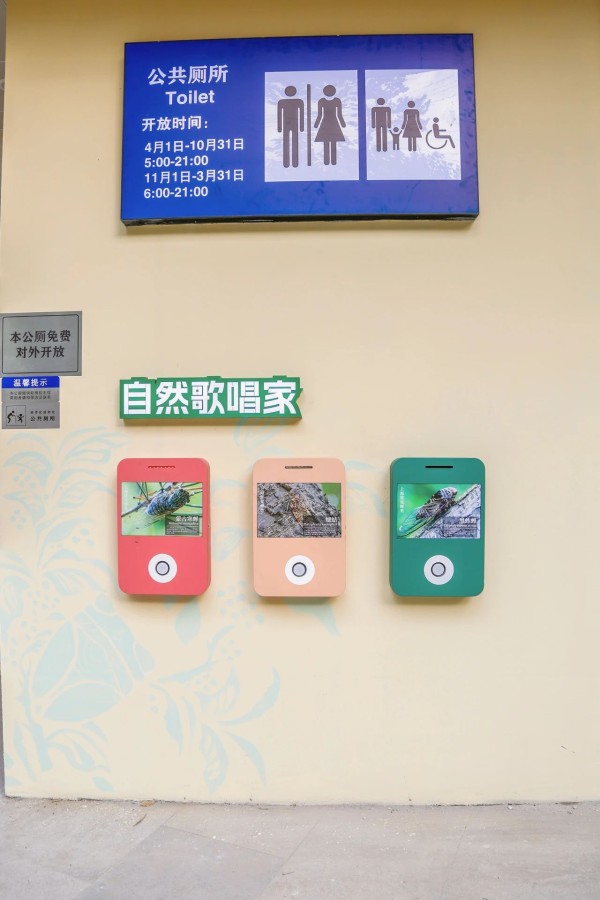 蝉鸣公厕以展现上海特有的蒙古寒蝉、蟪蛄和黑蚱蝉三种蝉为核心,精心打造“听蝉鸣”“观蝉画”“学科普”“悟禅意”四种意境,让市民游客在如厕之余,也能领略到蝉文化的独特魅力。其中,独特的声感互动装置设计更是别出心裁,只需轻轻触动按钮,便能聆听蝉鸣等自然声音,唤起人们对童年的美好回忆和对大自然的无限遐想。