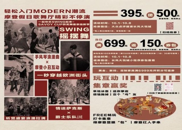 为增强现场氛围,上海长风大悦城特别打造了轮番上演的“摩登假日歌舞厅”。摇摆舞、萨克斯风演奏、爵士乐队Live及手风琴浪漫曲,将为现场观众带来一场场高品质的视听盛宴,营造出浓厚的艺术气息。
