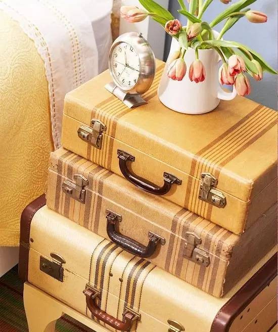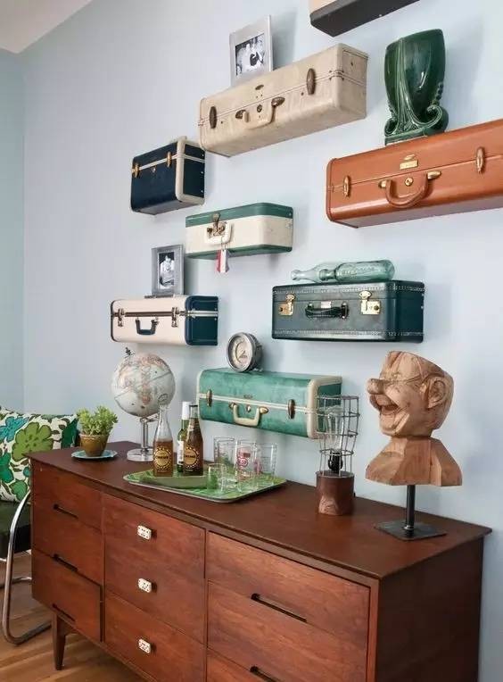 最简单的装饰方式。只需小心擦拭,放在客厅里就能变身茶几,如果是老式木制手提箱效果会更好!酷酷的,很带感。把这种“大块头”置于宽敞的客厅,能够成为别具一格的茶几。2墙面隔板如果有很多废弃的行李箱,不妨在墙上挖几个洞塞进去,多么别致的墙面隔板,箱子本身的色彩、造型都潮爆了。如此一来,不仅可以在箱子上放摆设,箱内还能收纳各种物件。3立式储物柜