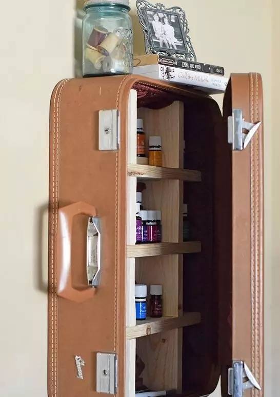把行李箱里面做好隔层,挂于墙上,一个立式储物柜就诞生了,实用而特别。嫌上面的方法太麻烦,直接悬挂也是个不错的选择。4收纳箱废弃的行李箱仍能发挥它收纳、储物的本来功能。稍作装饰,一个收纳箱就大功告成。将行李箱内部重新规划,装上两三层隔板,这绝对是你见过的花钱最少却最有品位的收纳柜。5收纳柜