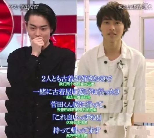 在一个综艺节目中,有“漫改王子”之称的山崎贤人提起自己的好友——有“变色龙演员”之称的菅田将晖的时候,就提到过因为两人都很喜欢古着,会一起去古着店,在对方家看到喜欢的衣服,也会直接穿回家。