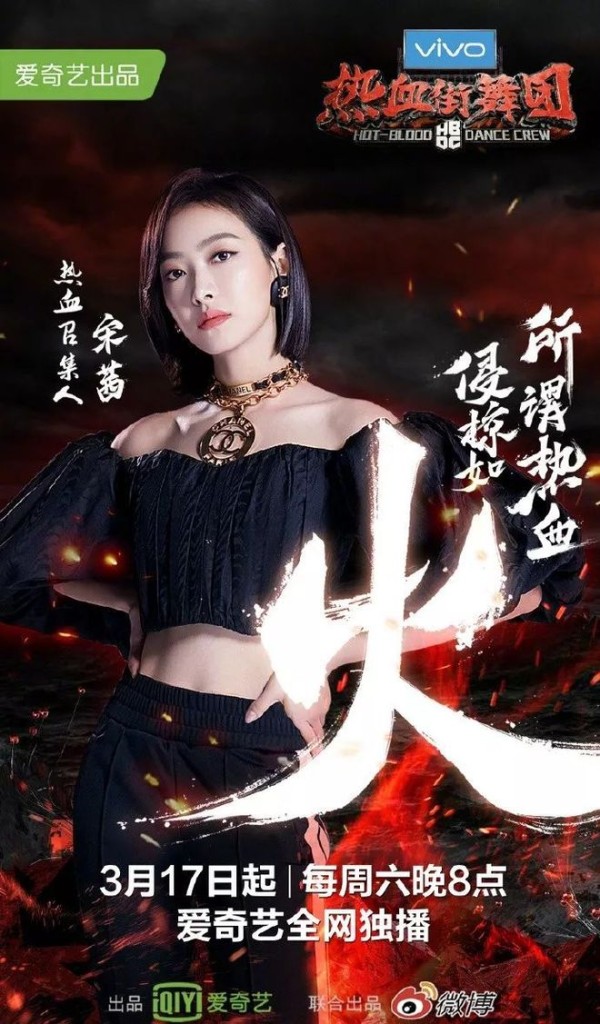 比如,宋茜在《热血街舞团》的热血召集人中的造型:一字肩上衣搭配香奈儿复古耳环、项链。