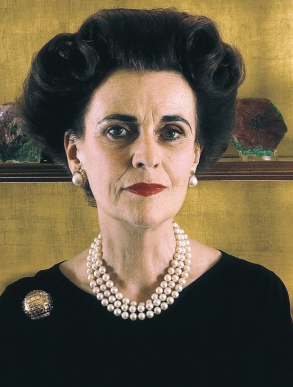 珍珠项链。图为玛格丽特(阿盖尔公爵夫人,1912—1993),声名狼藉的英国社会名流,因与伊恩·坎贝尔 (Ian Campbell,阿盖尔公爵)结婚和离婚而臭 名昭著。她年轻时是有名的社会人物和摩登女郎,曾资助过诺曼·哈特奈尔和维克托·斯蒂贝尔的事业。照片拍摄于 1980 年,依旧展示了其经典的穿衣风格, 尤其是脖子上戴着的三股 珍珠项链。