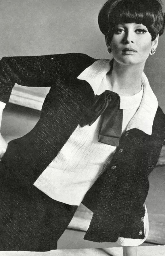 香奈儿1956年款黑色雪尼尔套装,夹克靠上部位有三个纽扣,搭配裹身裙。白色缎子车褶皱衬衫搭配松垂的黑色缎子蝴蝶结,夹克袖口高开叉。秉承香奈儿从20世纪20年代起建立的风格,此款套装证明了它的永恒经典。