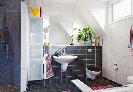 黑白搭配的卫生间,呈现出干净素雅的感觉。整洁自然的空间给人一种舒适之感。红色条纹地毯,绿色盆栽,亮黄色的小水瓢,鲜明的色调,能让人眼前一亮。而地毯的设置能更有效的防治滑到的情况发生。尤其是有小孩或老人的家庭,卫生间防滑问题就一定要得到解决。