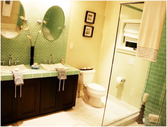 用瓷砖与乳胶漆来分隔出干湿区,非常有特色,清新的绿色墙面瓷砖,搭配深褐色的木质衣柜,在融入暖黄色的墙面,整个空间十分自然清新,给人一种舒服自在之感。