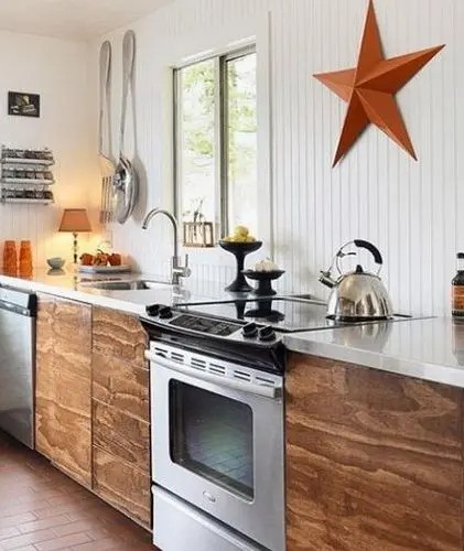 厨房装修搭配TIPS:除了美丽的壁纸,各种有趣的立体墙饰,也是呆板空间的活跃剂。操作台背景墙的立体五角星,装饰的同时给空间带入更多色彩,而大汤勺以及叉子的悬挂,能让食欲大开。