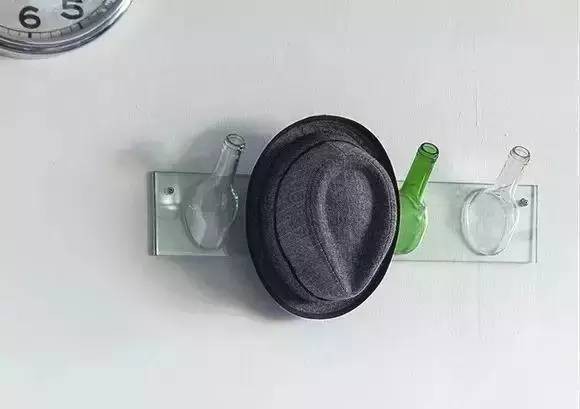 回收玻璃瓶挂衣架。废弃瓶将其切割,再安置在镜面的板上,变成一个美观的挂衣架,功能还挺多,可以当镜子、可以给瓶口留言便签、给瓶颈挂上服饰。