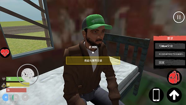 3、右侧“要求”就是任务目标,下楼去和疯mosi交谈,将屏幕中心的白色光点对准角色即可触发对应的动作,“按此与摩西交谈”。