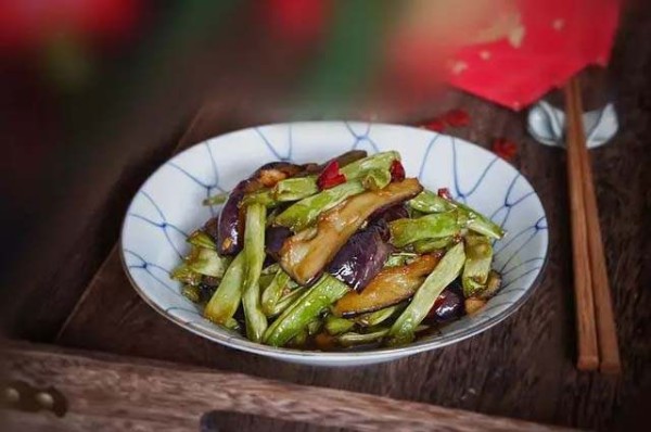 1、豆角抽掉老筋洗淨,切成小段;茄子洗淨,切成跟豆角一樣長短的段。