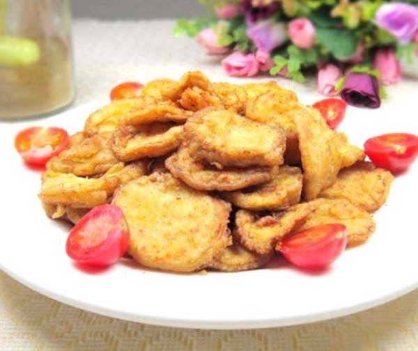 4、取出醃好的菇,先裹上麵糊(最好裹厚一些),再沾一層麵包糠,放入油鍋中用小火炸至金黃色,撈出,瀝乾油,裝在鋪上生菜葉的盤中。