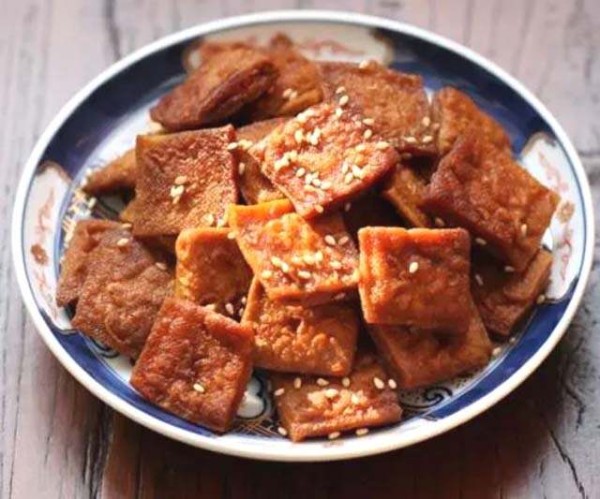 食材:白豆腐乾一斤,糖3大匙,醬油1大匙,鹽1小匙,橄欖油適量,熟芝麻少許