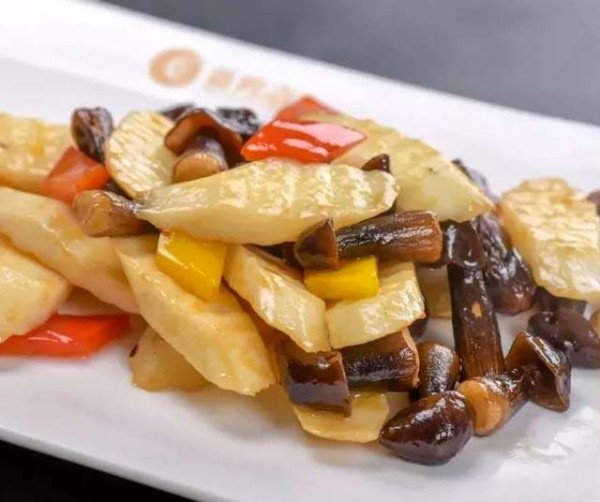 材料:鐵棍山藥,黑雞縱菌,彩椒,素XO醬,素蠔油,鹽,磨菇精,香油,生粉水