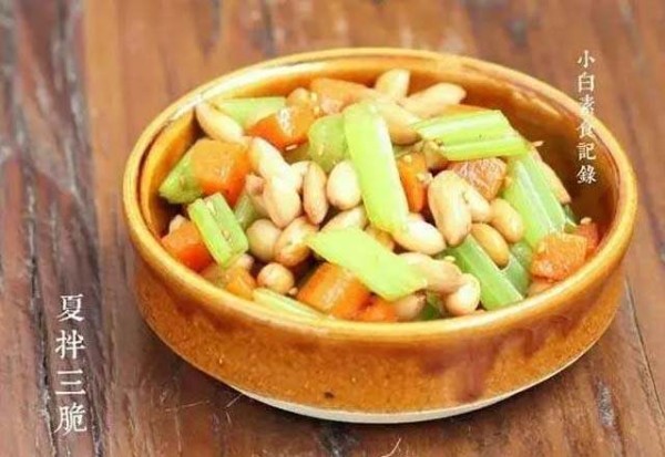 3、過完冷水的胡蘿蔔芹菜花生控掉水份,加上鹽糖,生抽陳醋,香油白胡椒粉拌勻即可,當然如果喜歡可加1小匙辣椒油同拌。