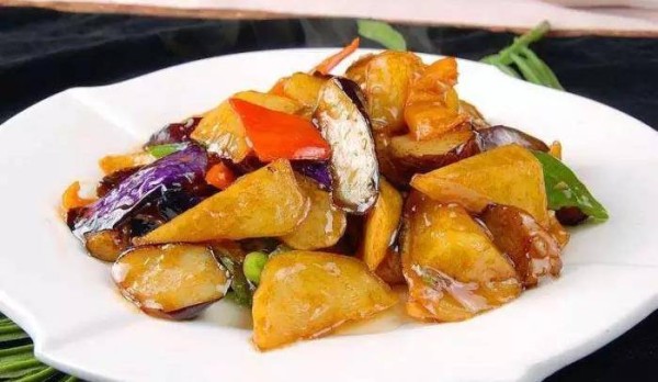 2、锅中多加油,七成热时土豆和茄子炸两三分钟捞出,青椒过油后立即捞出。
