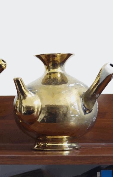 我书架上两个金色的壶的作品,是古希腊的陶罐器型和中药壶的一个嫁接,做这个也是跟我爸有关。其实我和我爸是互相关心的,只是有时候他不懂我的想法,我也不理解他的思维。