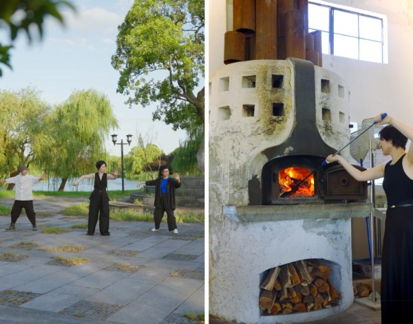 左:和朋友一起打八段锦;右:在面包窑烤面包