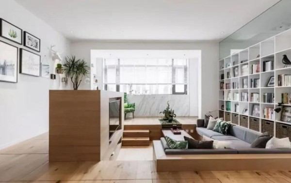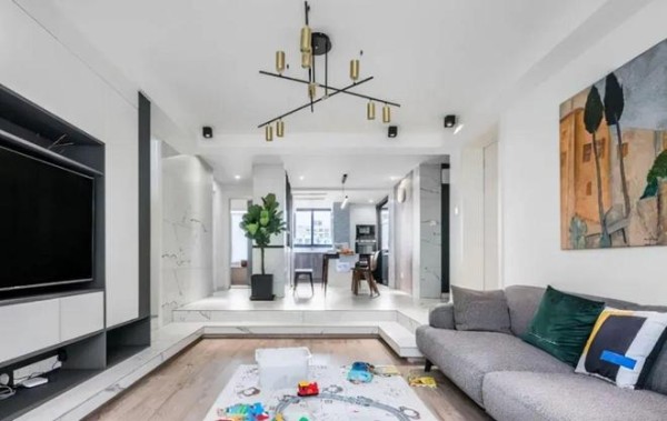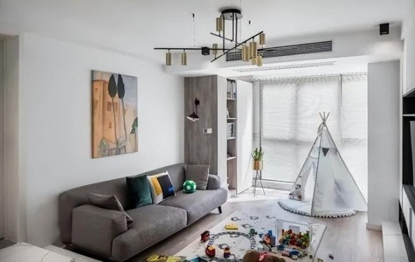 不需要过多的设计,只要舍弃茶几就能实现。沙发和电视柜可以根据情况保留,比如上面这个客厅设计案例,就很好地兼顾客厅与儿童娱乐间的功能,满墙的电视柜还能提升家中的收纳能力,值得所有朋友学习。