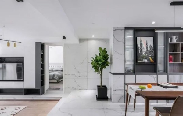客餐厅一体的空间布局,餐厅位置的地面抬高,错层式的设计方式也让空间变得更加灵活多变,甚至给人一种别墅的居住体验。
