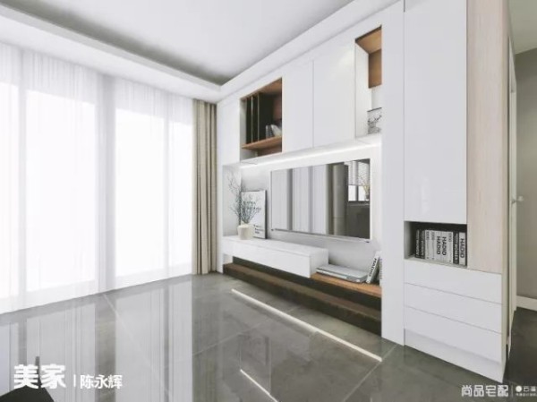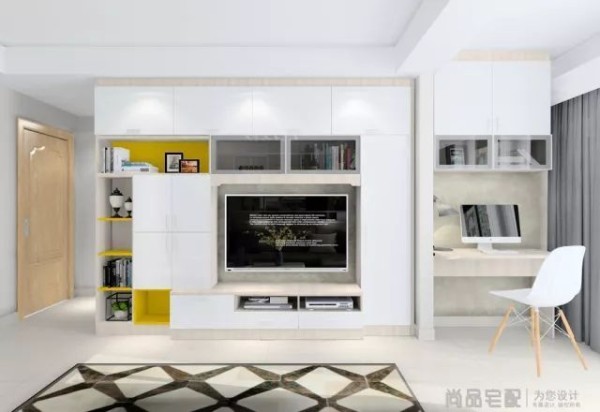 电视柜充分利用了垂直空间,白色的柜门和墙壁融合在一起,延伸了人的视线,扩大了空间感,时尚简约的造型减轻了拥挤和杂乱感。